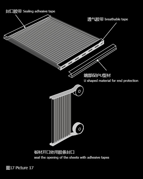 D.確保根據(jù)具體應(yīng)用情況使用適當(dāng)?shù)姆饪谀z帶,注意:在彎曲安裝的情況下,因?yàn)榘宀膬啥碎_口均向下所以兩端都使用專用透氣膠帶封口。注意對端部封口膠帶的保護(hù),避免在安裝型材時損壞,可以采用聚碳酸酯U型材進(jìn)行保護(hù) (圖一17C)