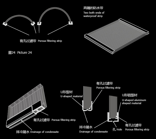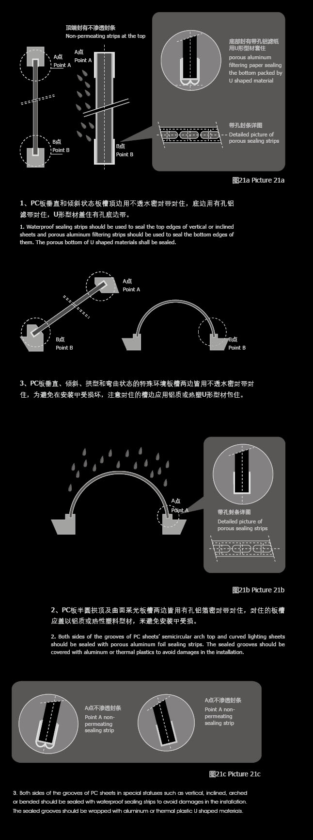 在圓弧型拱頂安裝中,兩端的槽的兩端應(yīng)用有孔過濾帶封住。注意:板材的兩端要保持清潔,便于冷凝水的排出。